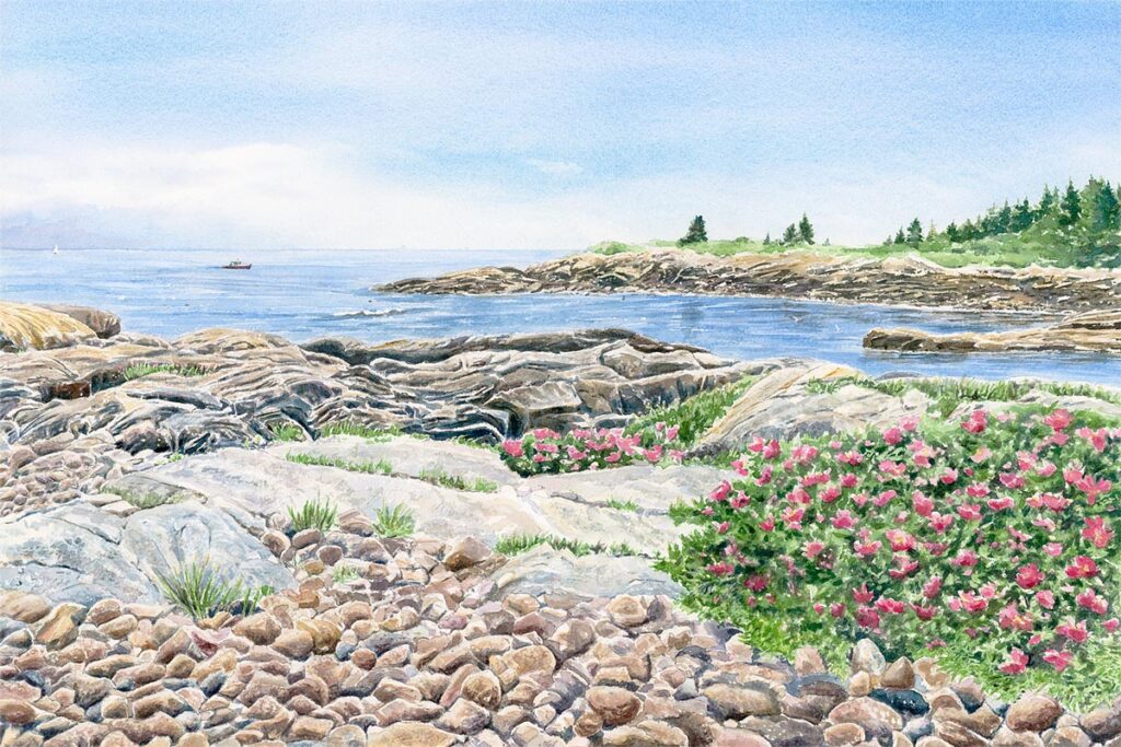 This Downeast Maine painting was inspired by a visit to Blueberry Hill on the Schoodic Peninsula. The beach roses and cobblestones line the shore and perfectly frame the ocean beyond. This is probably my favorite spot in this portion of Acadia National Park. It’s just gorgeous. You may even get lucky and see seals offshore.